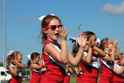 A – The games are played on Saturdays in the Tampa Bay area. We play teams in Manatee, Hillsborough, Pinellas, and DeSoto Counties. The fields are typically no more than 75 minutes away from our home field. The first game (Tiny Mites) begins at 9:00am and the games are played every two hours throughout the day. Junior TIny Mite sideline cheers at home games only.