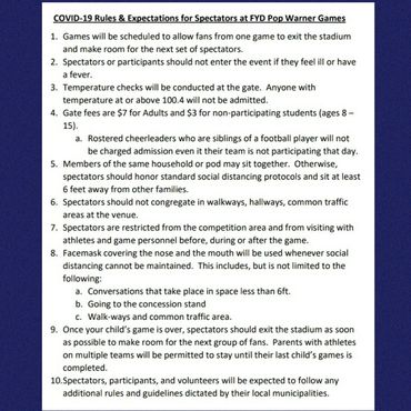 · ALL participants, volunteers, and coaches must fill out and sign a Pop Warner COViD-19 waiver. (The form is located below and in our forms and policy page)